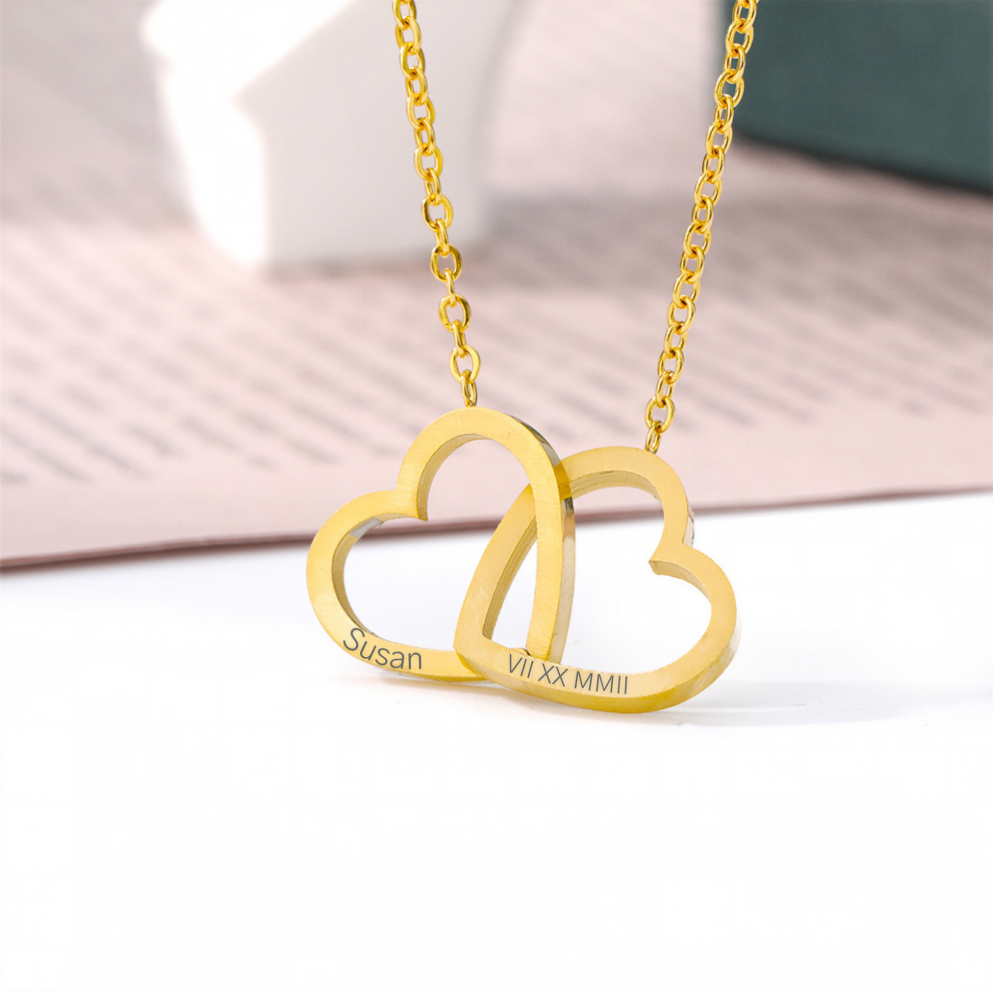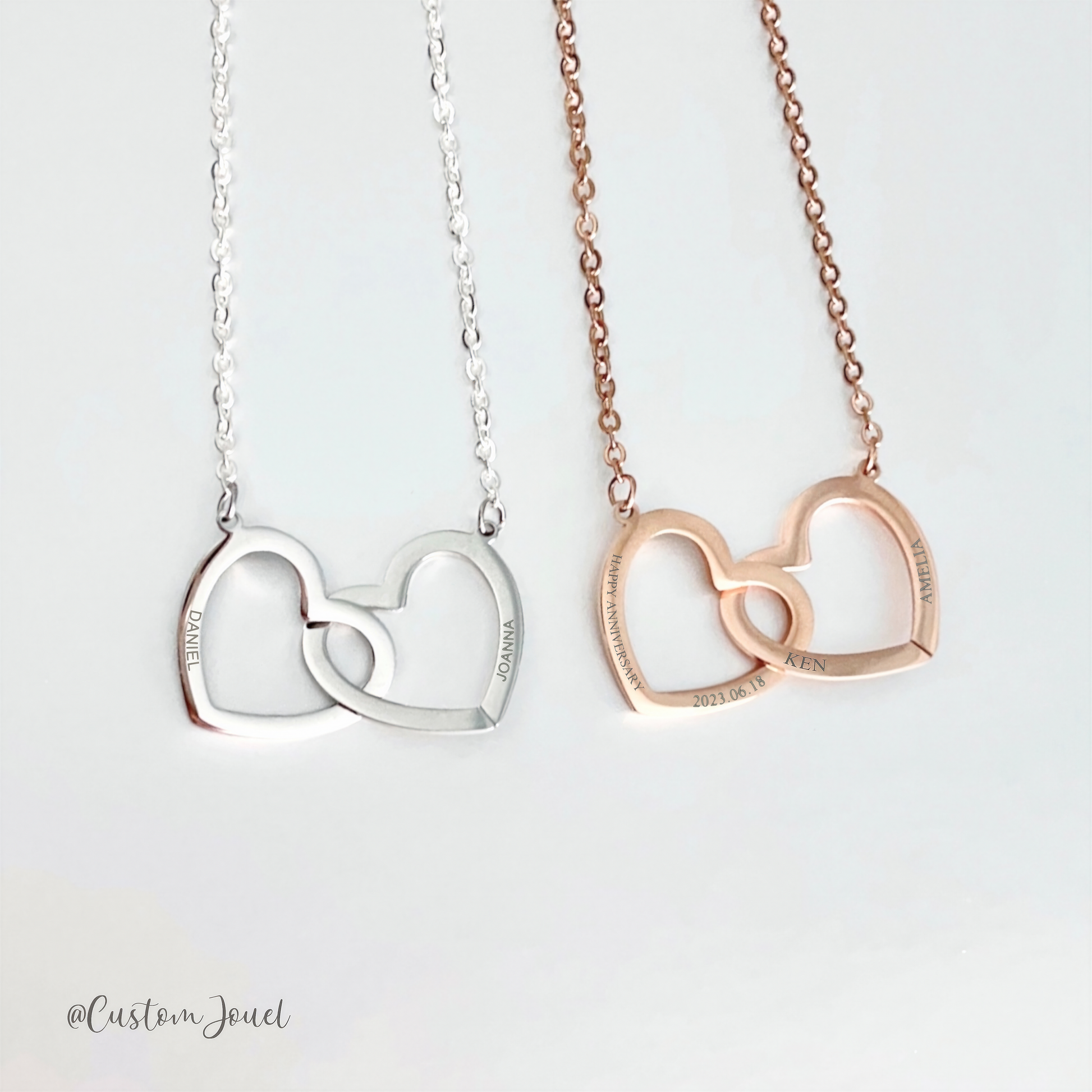 - Style: Double interlocking open hearts necklace, allowing multi names / short sentences to be engraved