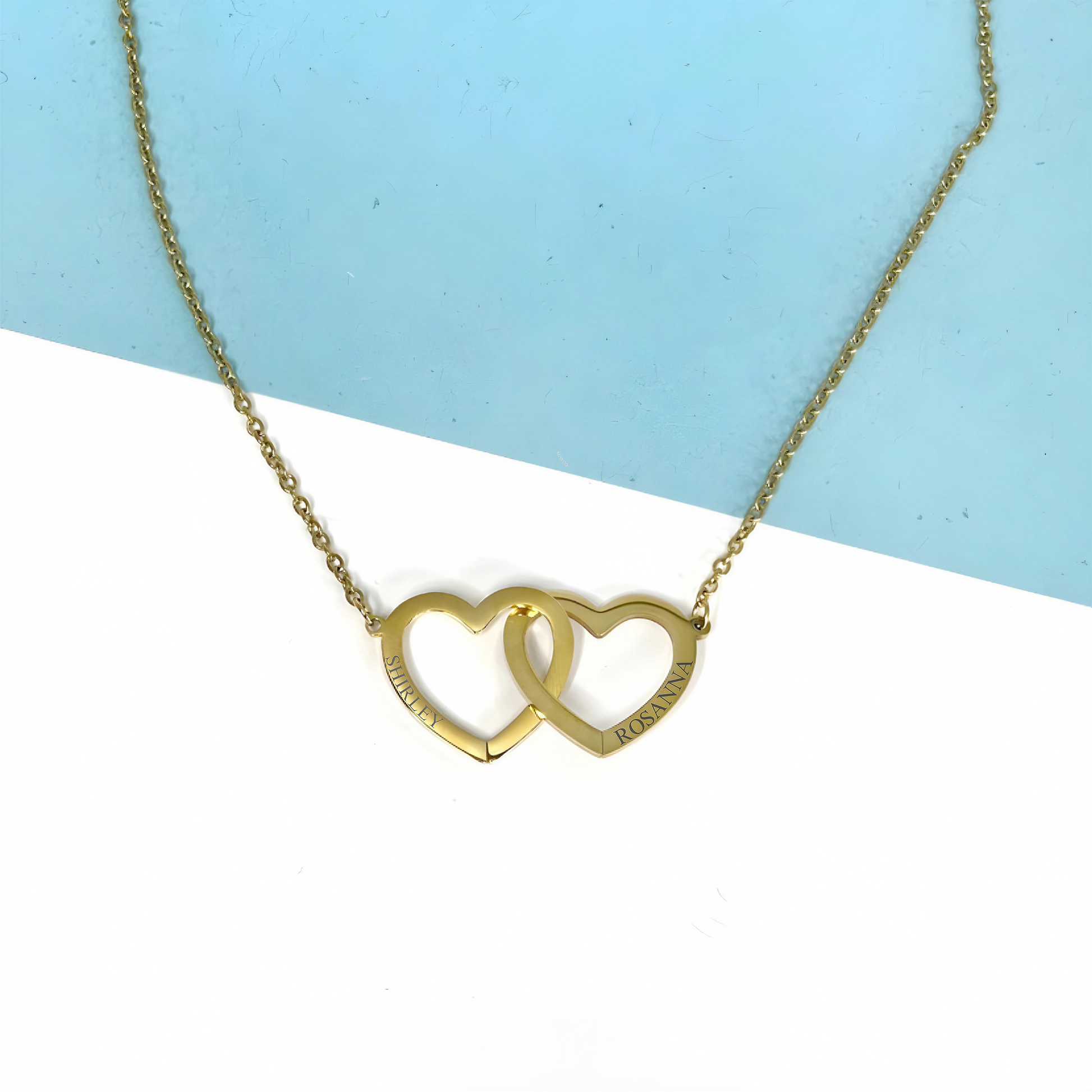 Introducing our exquisite Double Interlocking Hearts Necklace, a symbol of everlasting love. Crafted with precision, this necklace not only beautifully intertwines two hearts but also offers the unique option to personalise it with 1-4 names, elegantly engraved around the sides, creating a cherished keepsake for you or your loved ones.